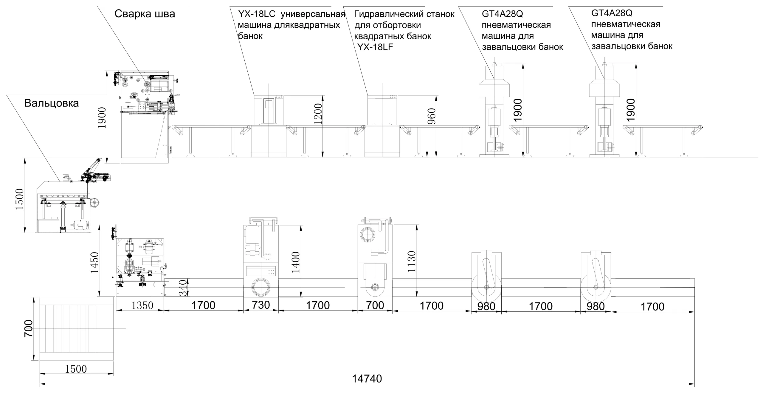 Производственная линия подходит для полуавтоматического производства квадратных банок объемом 10-20 литров. Общая мощность: примерно 35 кВт, общая площадь: 65 кв.м, общая длина: примерно 15 метров, общее количество рабочих: 8-9 человек. Производительность: 15-20 банок в минуту. Диапазон высоты квадратных банок: 170-450 мм. Диапазон диаметра квадратных банок: 300-320 мм.