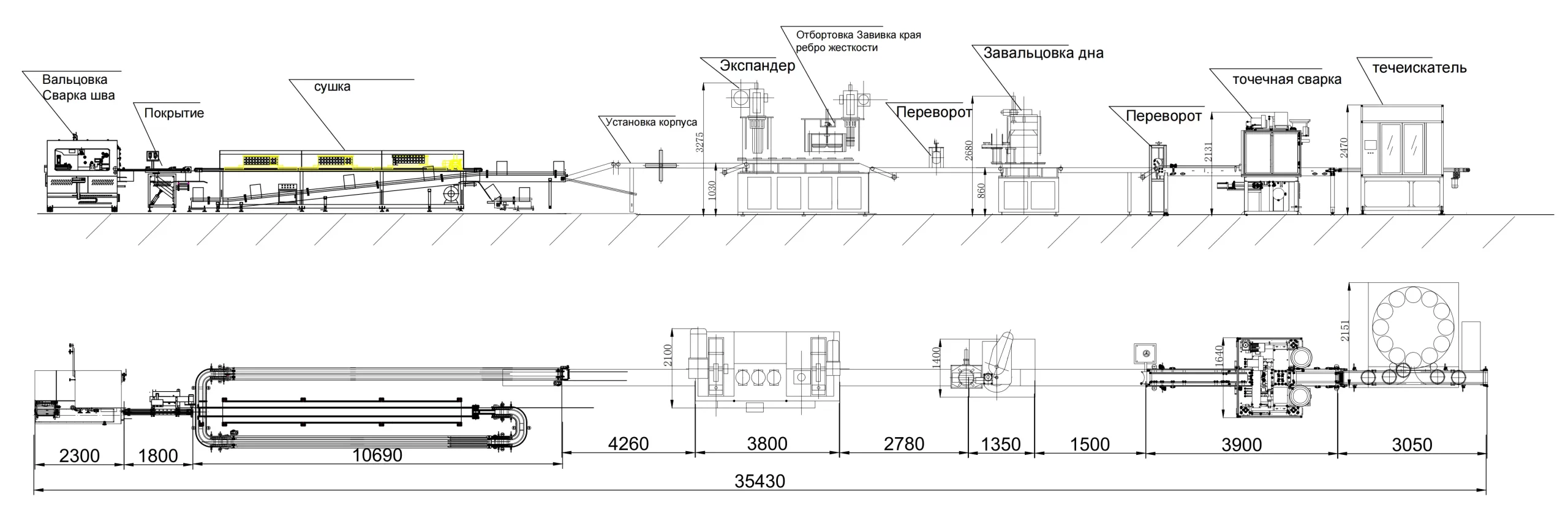 Технологический процесс: резка жестяного листа на заготовки-округление-сварка-внутреннее и внешнее покрытие (внутреннее порошковое покрытие и внешнее покрытие)-сушка-охлаждение при транспортировке-коническое расширение-фланцевание-завивка-бортировка-подача нижней крышки-соединение-переворачивание-сварка ушек, покрытие и сборка металлической ручки-проверка на герметичность-упаковка.